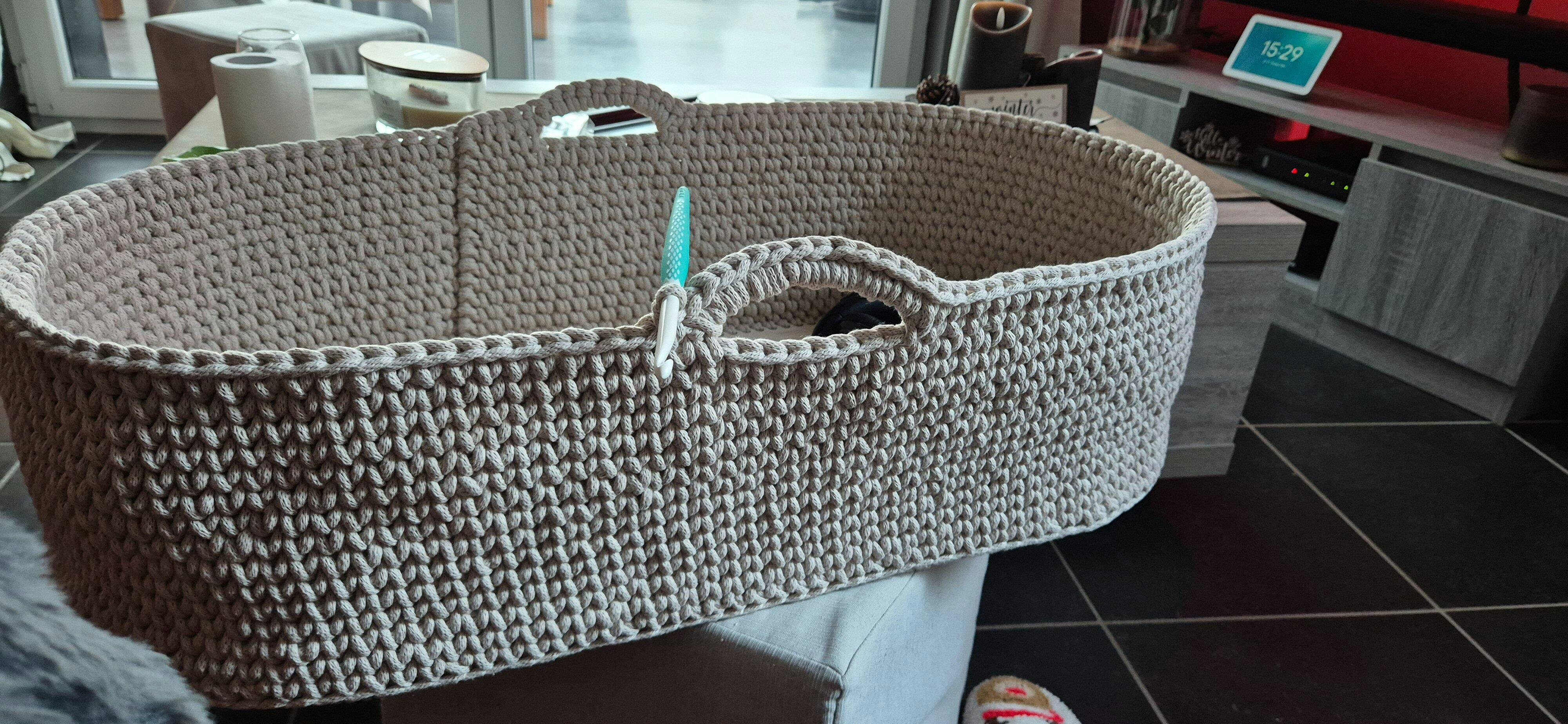 Le résultat est incroyablement net : l’intérieur comme l’extérieur du couffin sont parfaitement réguliers, sans aucune marque de début ou de fin de rang.